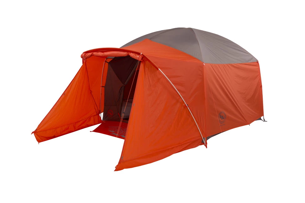 A spacious family or group tent with an oversized, pole-supported front vestibule for awning-covered camp-chair chilling, or covered gear storage