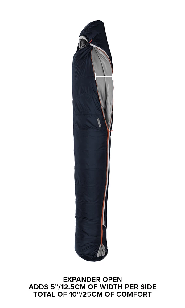 Expanded comfort with two zippered panels, running from shoulder to footbox, adding five extra inches of room to each side – 10″ total when completely expanded