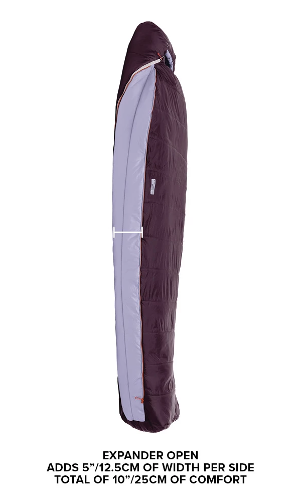 Expanded comfort with two zippered panels, running from shoulder to footbox, adding five extra inches of room to each side – 10″ total when completely expanded